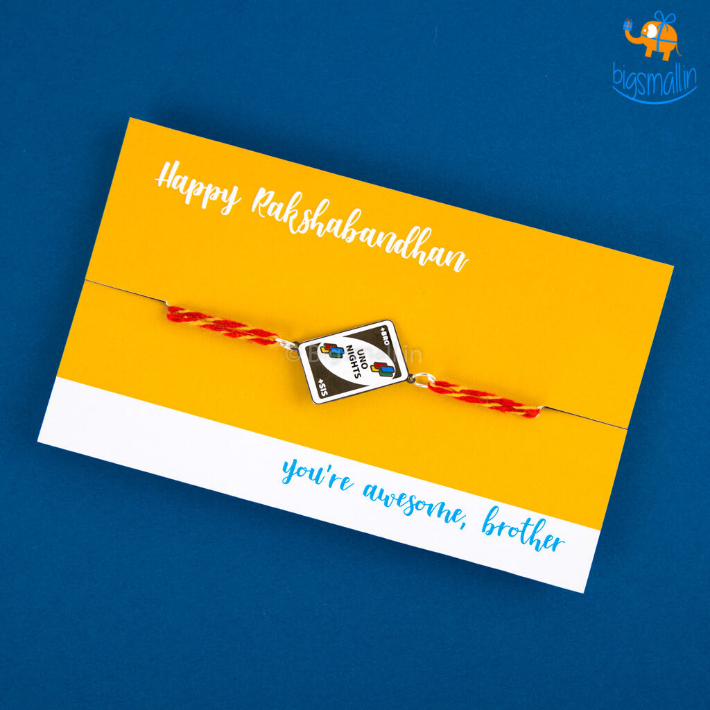 • Beautiful rakhi with multi-color threads and a cute brass sheet embellishment in the form of a Draw 4 Uno Card