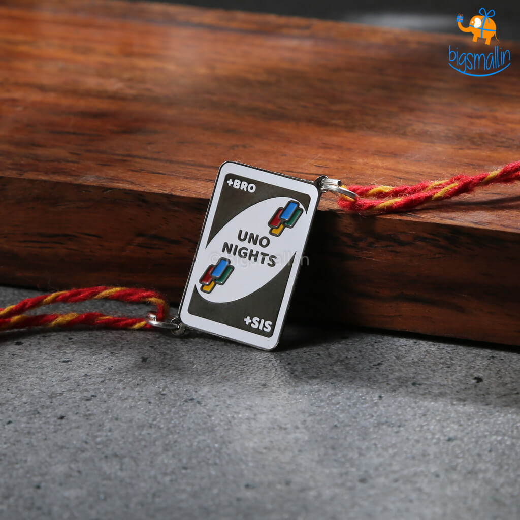 Presenting the Bro Sis Uno Nights Rakhi, which is guaranteed to generate tonnes of nostalgia. With a cute brass sheet embellishment in the form of the dreaded Draw 4 Uno card, that led to many bitter-sweet fights, this one is a precious semblance of the beautiful memories you guys shared while growing up.
