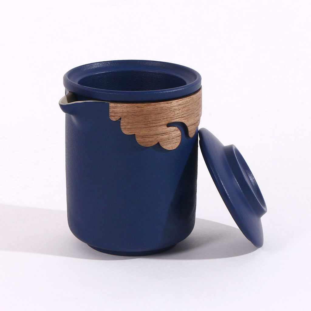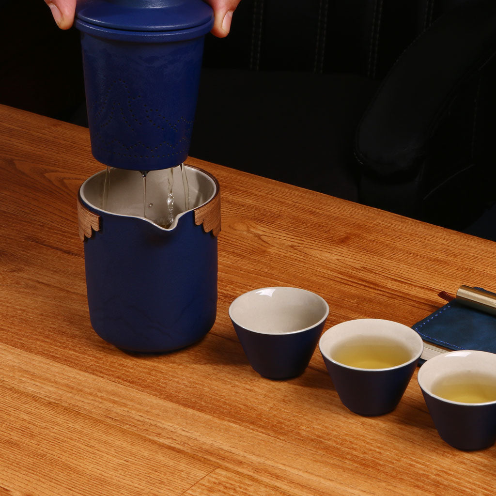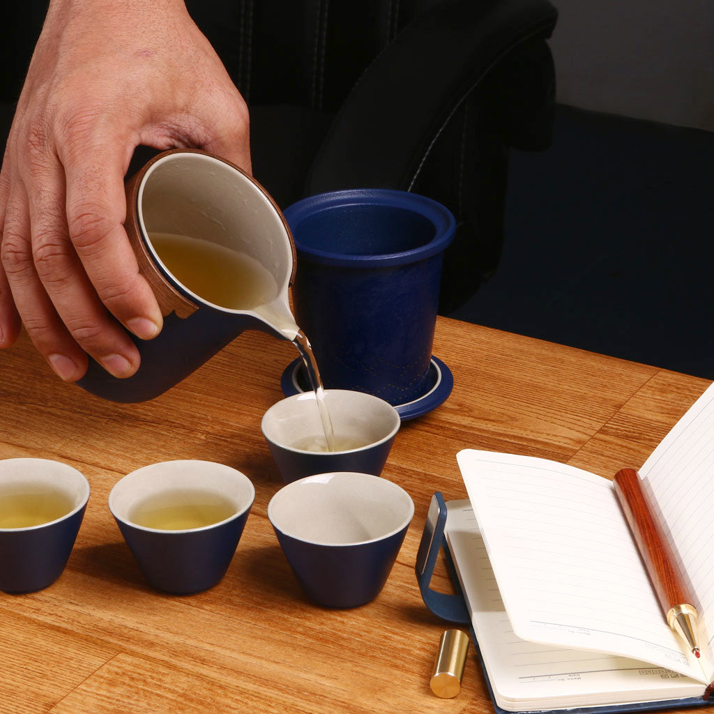 This luxurious portable tea set is crafted for tea lovers who appreciate elegance and convenience. Encased in a sophisticated blue leather-textured briefcase, it includes a teapot with a wooden accent, four ceramic teacups, and a matching leather wallet and pen, making it a perfect gift or travel companion. The minimalist yet refined design blends tradition with modern style for a perfect tea experience anywhere.
