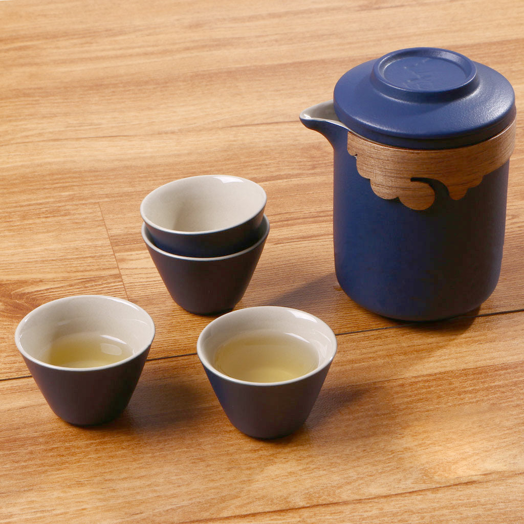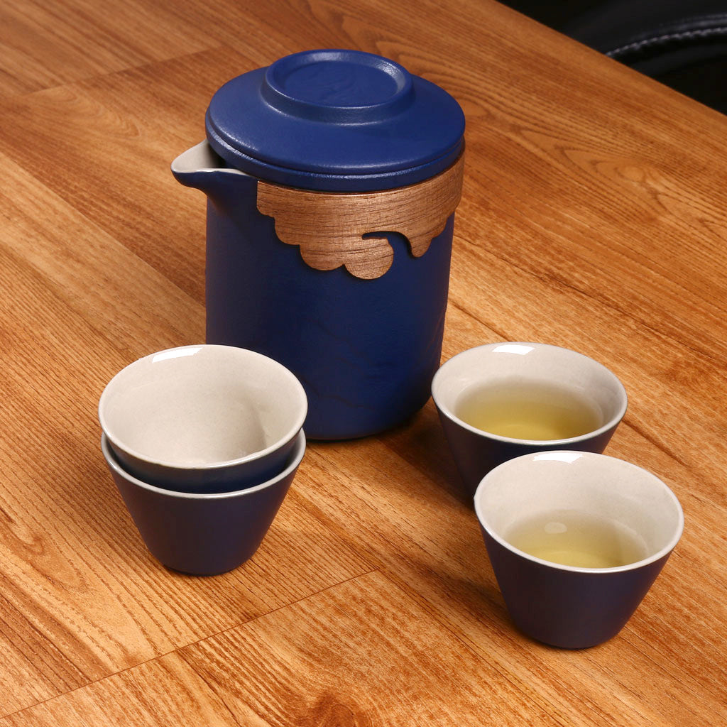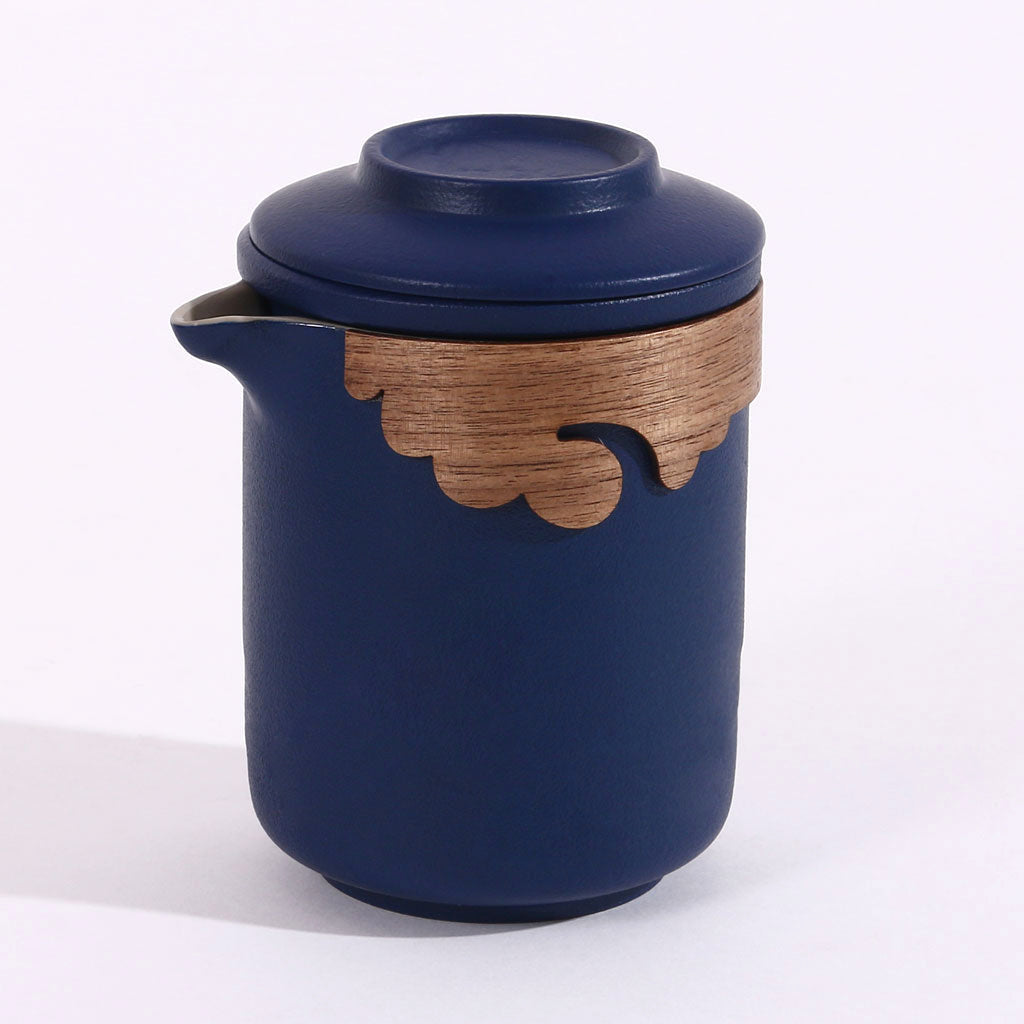 This luxurious portable tea set is crafted for tea lovers who appreciate elegance and convenience. Encased in a sophisticated blue leather-textured briefcase, it includes a teapot with a wooden accent, four ceramic teacups, and a matching leather wallet and pen, making it a perfect gift or travel companion. The minimalist yet refined design blends tradition with modern style for a perfect tea experience anywhere.