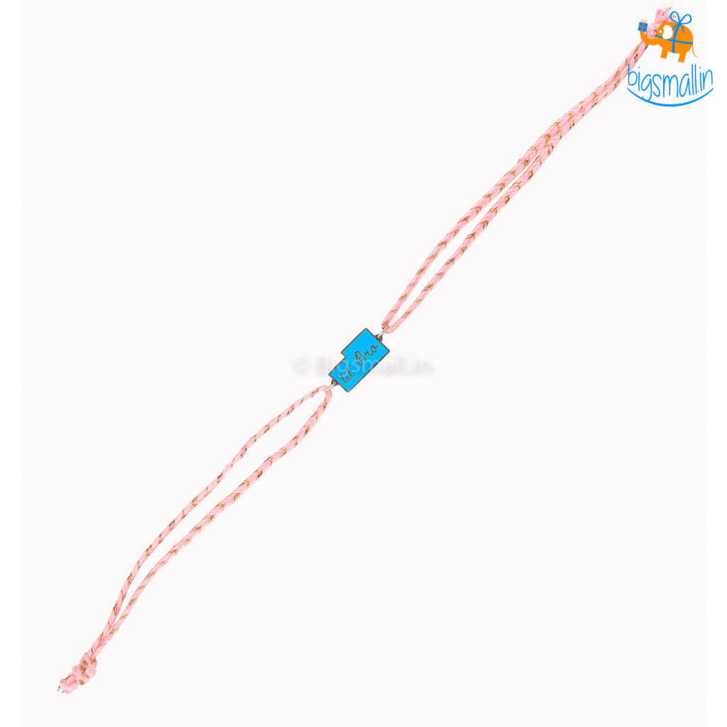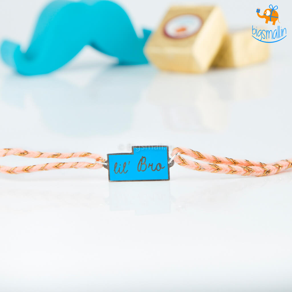 If you have a younger brother chances are that you probably remember the day your mother walked in with her little bundle of joy. You knew what love was when you played with his impossibly tiny fingers & toes. Now that he is all grown up & probably taller than you are, in your heart he will still remain the little munchkin he once was! He may irritate you to no end, claim all your stuff as his birthright, but this young man has got your back. Celebrate your unique bond with the personality-specific Lil' Bro Rakhi. It comes with a beautiful brass sheet in the middle of a peach-colored string that says, "Lil' Bro".