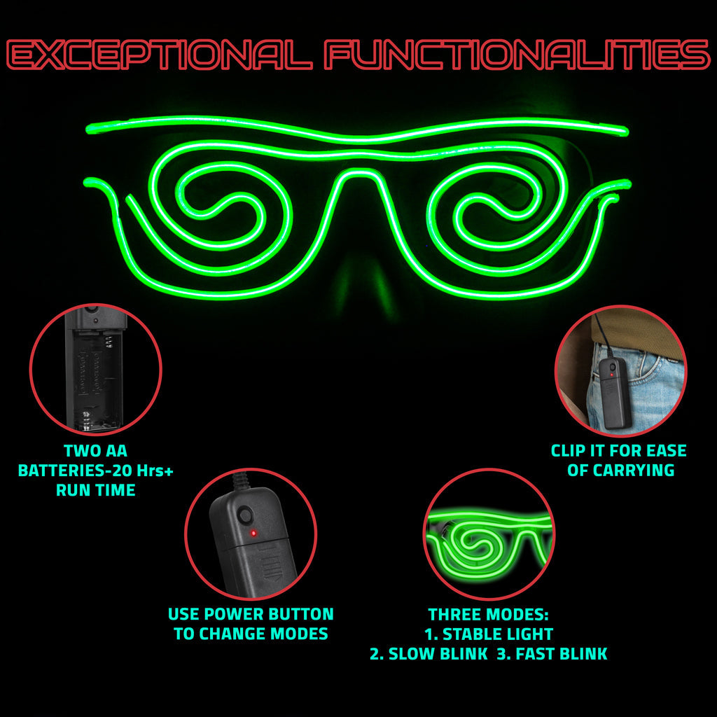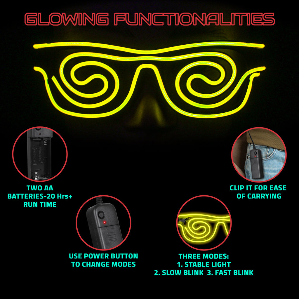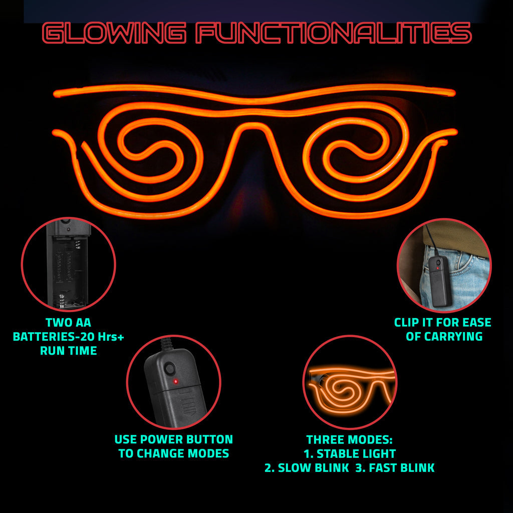 Get ready to shine with the Spin Shade LED Glasses! Perfect for any occasion—Halloween, birthdays, weddings, DJ nights, concerts, and carnivals—these unisex LED glasses feature three dynamic modes: steady glow, slow flash, and fast flash. Simply long-press to power on and tap to switch between modes. Enjoy a long-lasting glow with high-quality EL wire, keeping you illuminated and stylish all night. Be the center of attention and light up the night with SpinShade LED Glass!