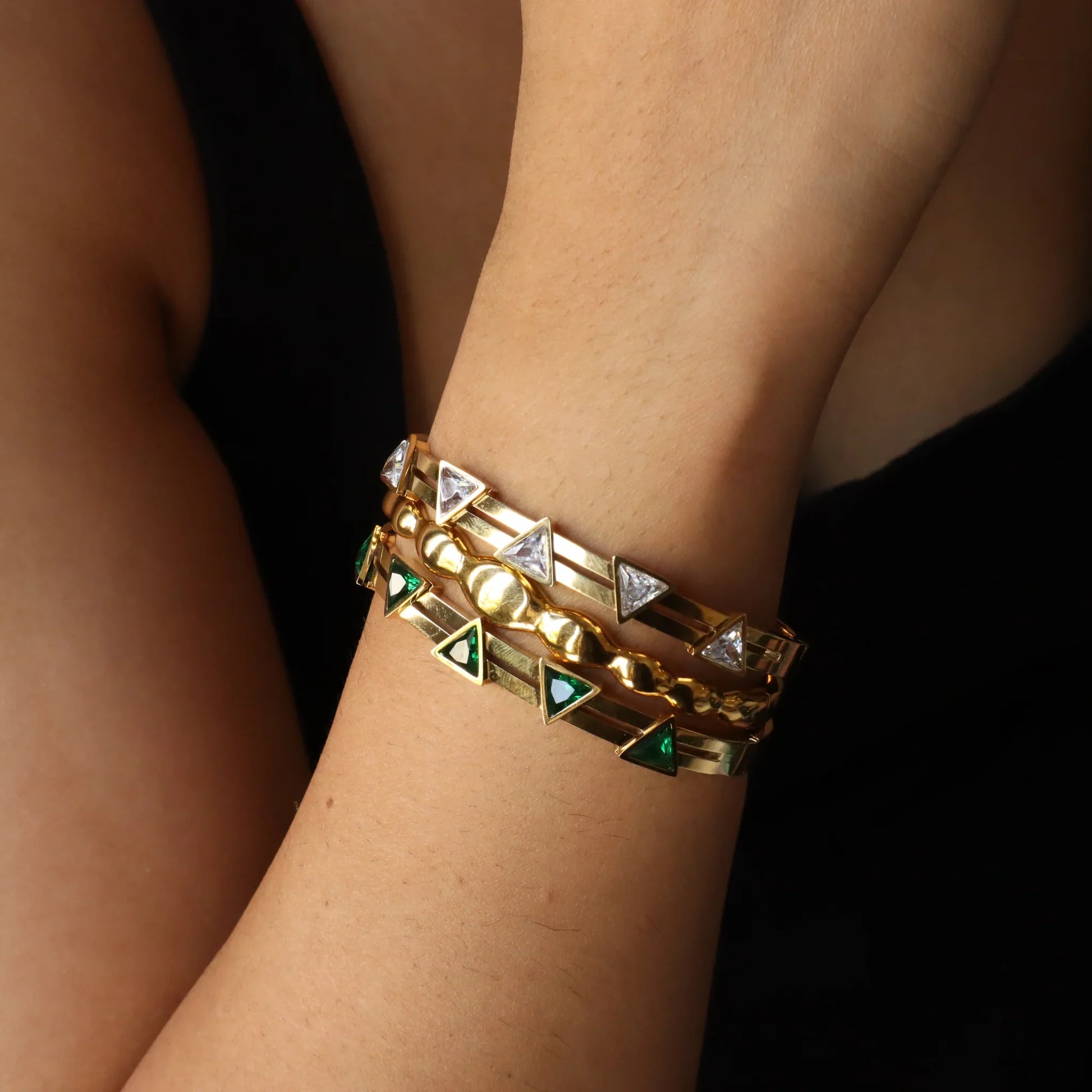 This lovely Triangle Studded 18K Gold Plated Bangle combines fashion with functionality. It is the ideal accent for any ensemble because of its elegant design and 18K gold plating. The lends a nostalgic touch. It is an essential item for everyone who is fashion-conscious.