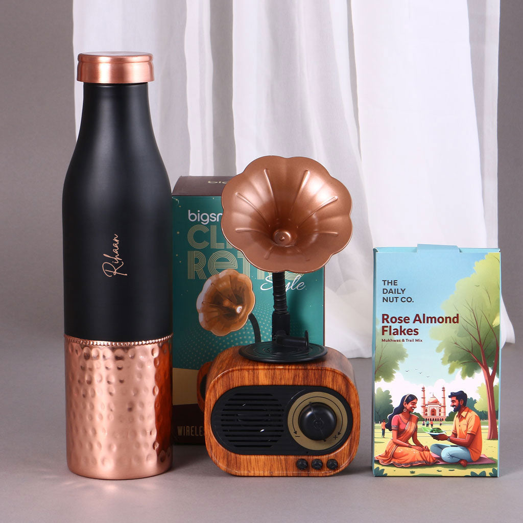 Package Includes: 1 x Elixir Copper Bottle, 1 x Vintage Gramophone Bluetooth Speaker, 1 x Rose Almond Flakes and 1 x Gift Box